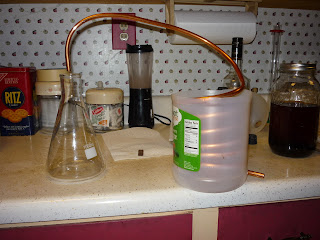 Water is heated in the Erlenmeyer flask over a low flame. The mason jar has the correct amount of ground coffee. The copper tube goes from the bottom of the flask, through a cork at the neck, and to the bottom of the mason jar with a filter made from t-shirt material. When the water starts a slow boil the syphon effect takes place and draws the hot water up the tube and into the mason jar with the coffee. Keep the flask on low flame for 2 minutes to let the coffee steep. Remove the flask from heat and as the flask cools it draws the coffee from the mason jar back to the flask. The filter keeps the grounds out of the finished brew. When it's done, remove the cork and tube and pour yourself a cup.